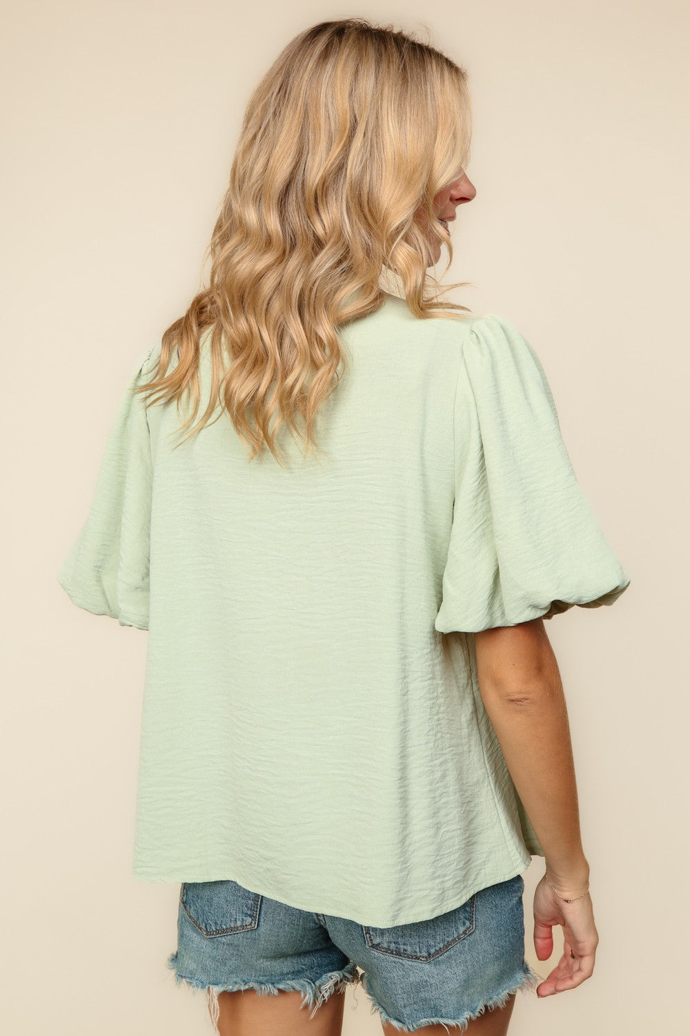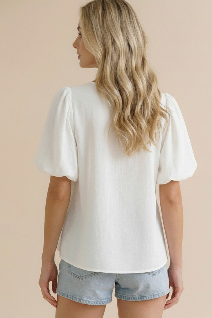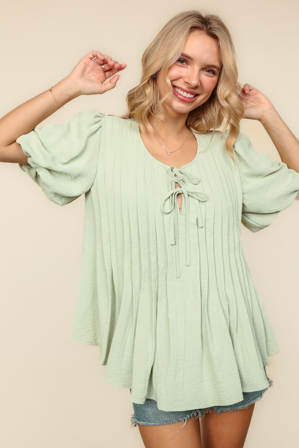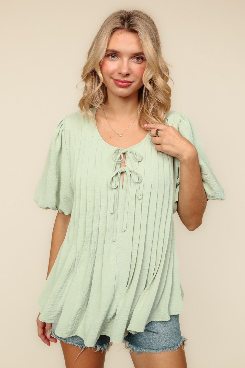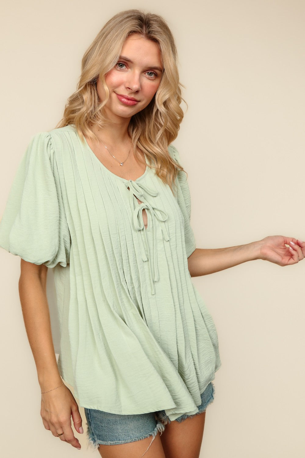 SCOOP NECK WITH RIBBON BOW DETAIL PLEATED BUBBLE SHORT SLEEVE SOLID WOVEN BLOUSE TOP