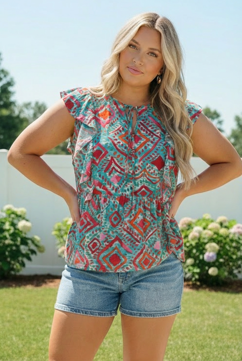 Bold prints in color combinations like blue and fuchsia have consistent sell through in boutiques because they photograph well and draw attention on the floor and online. Customers gravitate toward pieces that feel like a statement without requiring much effort to style, and this top delivers exactly that at a price point your shoppers will feel good about. The broad size appeal and seasonal versatility make it a strong candidate for reorders as summer inventory moves fast.