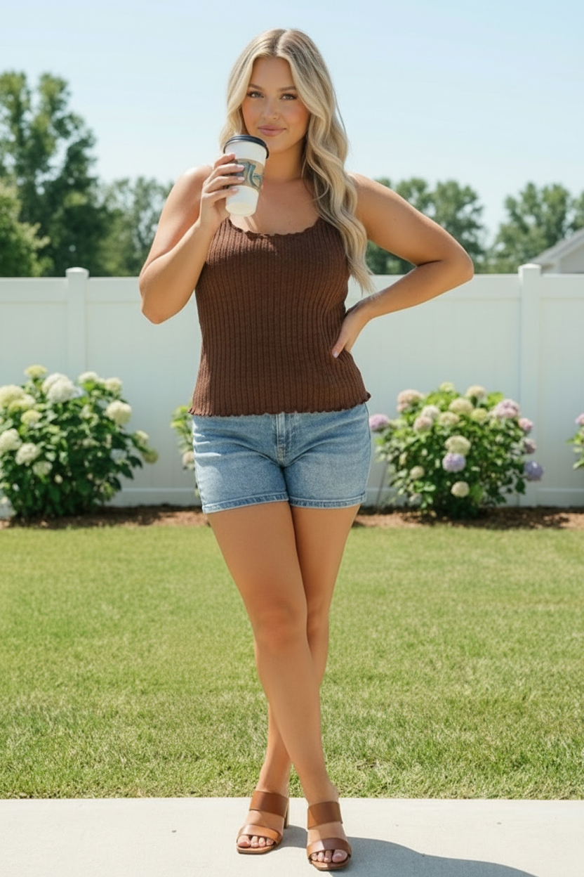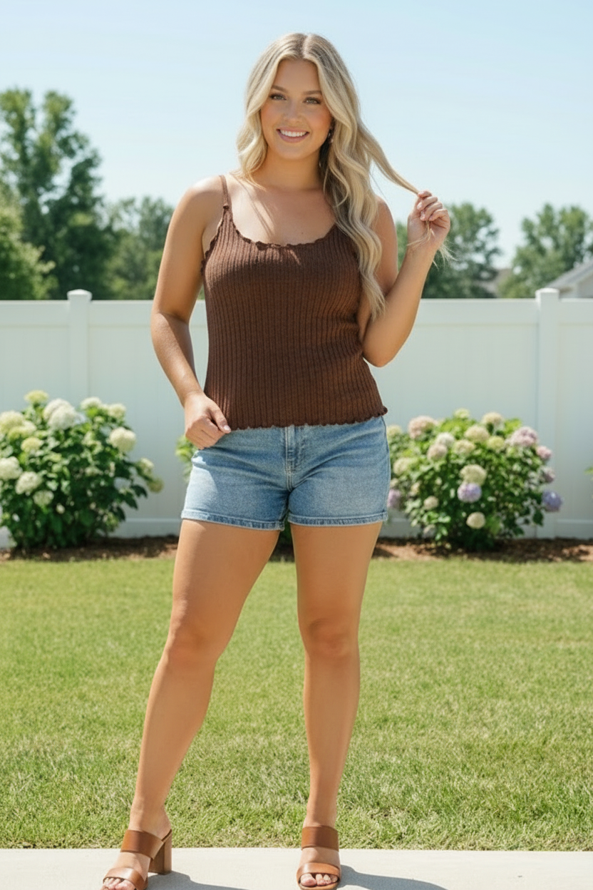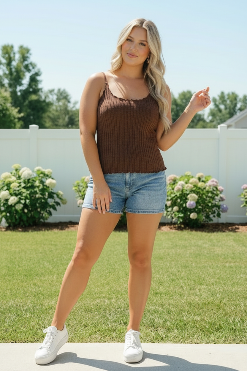 This rich chocolate brown ribbed cami brings a soft stretch knit construction to a flattering V neckline with delicate lettuce edge detailing at the hem and neckline. The adjustable spaghetti straps make sizing versatile while the ribbed fabric hugs in all the right places. A warm neutral tone like this moves fast in boutiques because it pairs with everything and photographs beautifully.