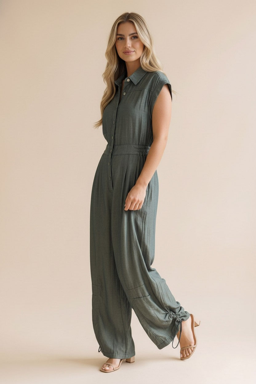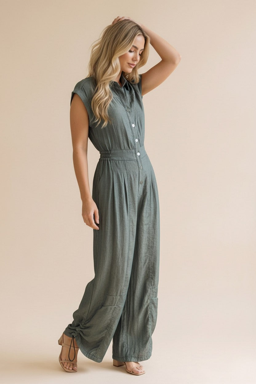 BUTTON DOWN DOLMAN SHORT SLEEVE SMOKED WAIST PINTUCK DETAIL CHAMBRAY STRAIGHT LEG JUMPSUIT