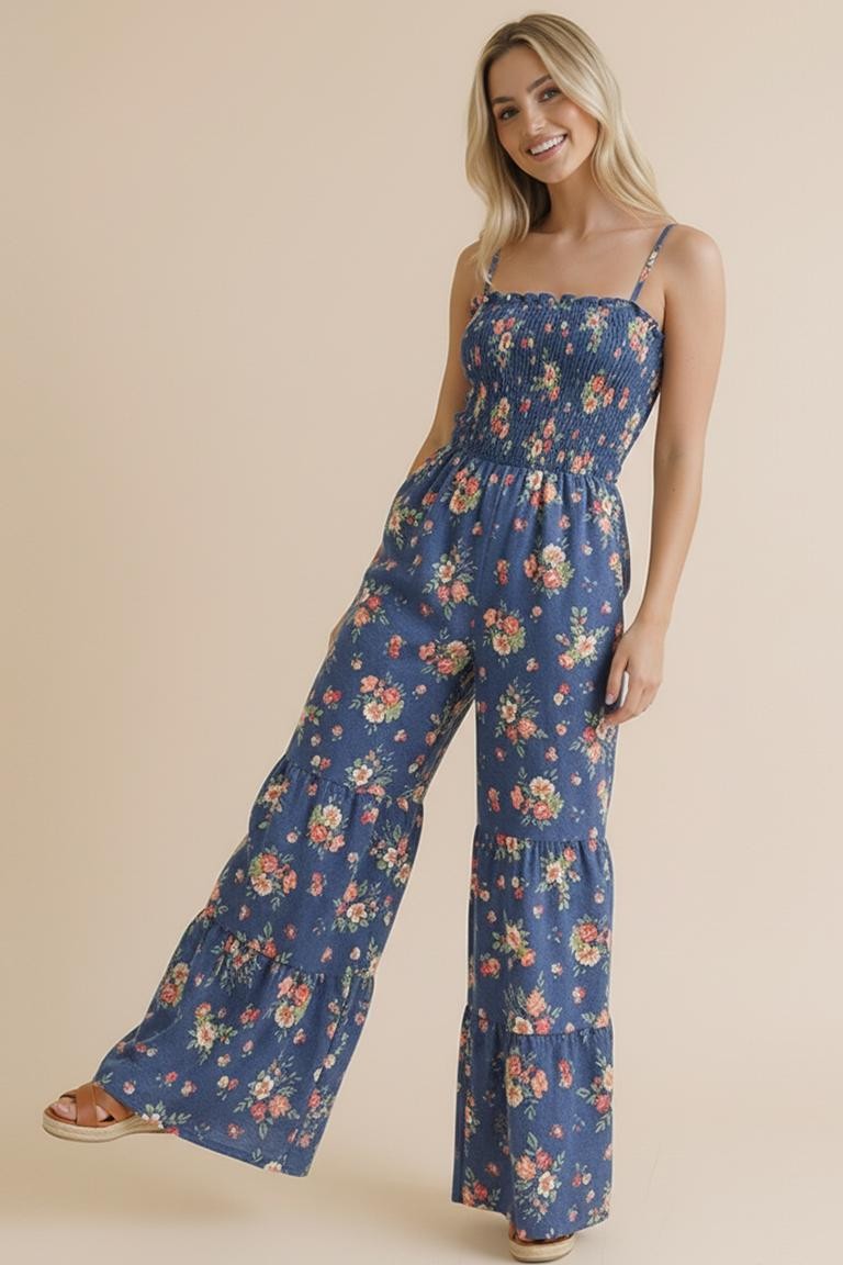 ADJUSTMENT STRAP SHOULDER SMOCKING WIDE TIERED LEG FLORAL PRINT WOVEN JUMPSUIT WITH SIDE POCKET
