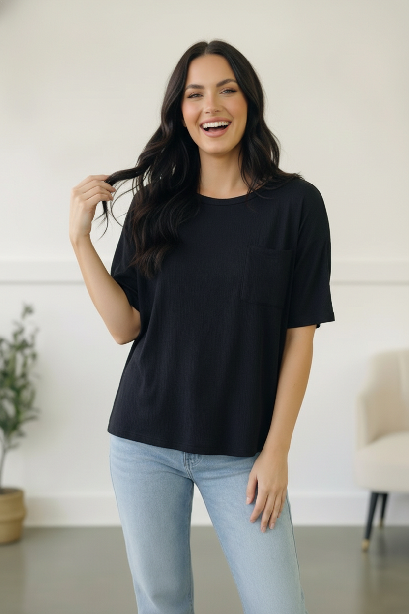 This stunning crinkle textured top designed with dolman sleeves, a chest pocket and a casual round neck will add charm to any outfit.
