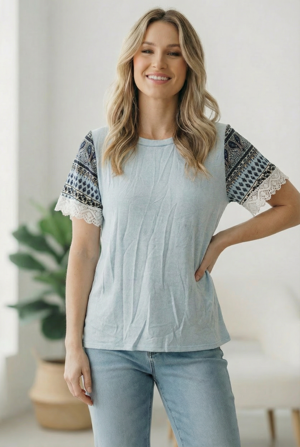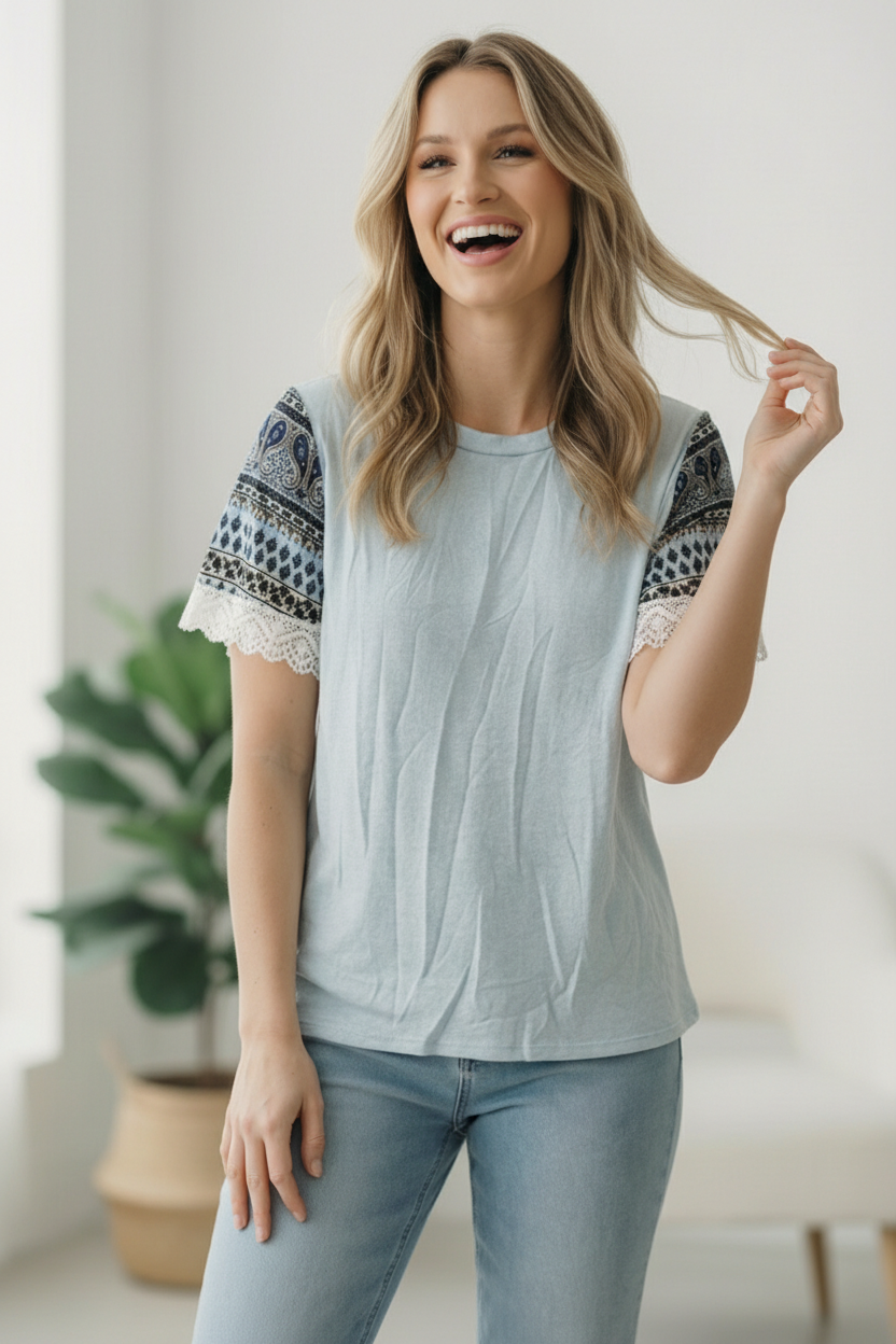 Blue Lace Print Sleeve Top