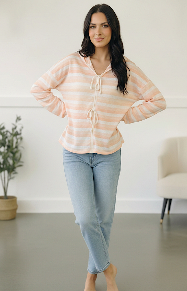 With trendy bow ties and drop shoulders, this loose fit French Terry top is perfect for early spring. With an elevated collar and long elastic bubble sleeves, this cozy top is eye catching!