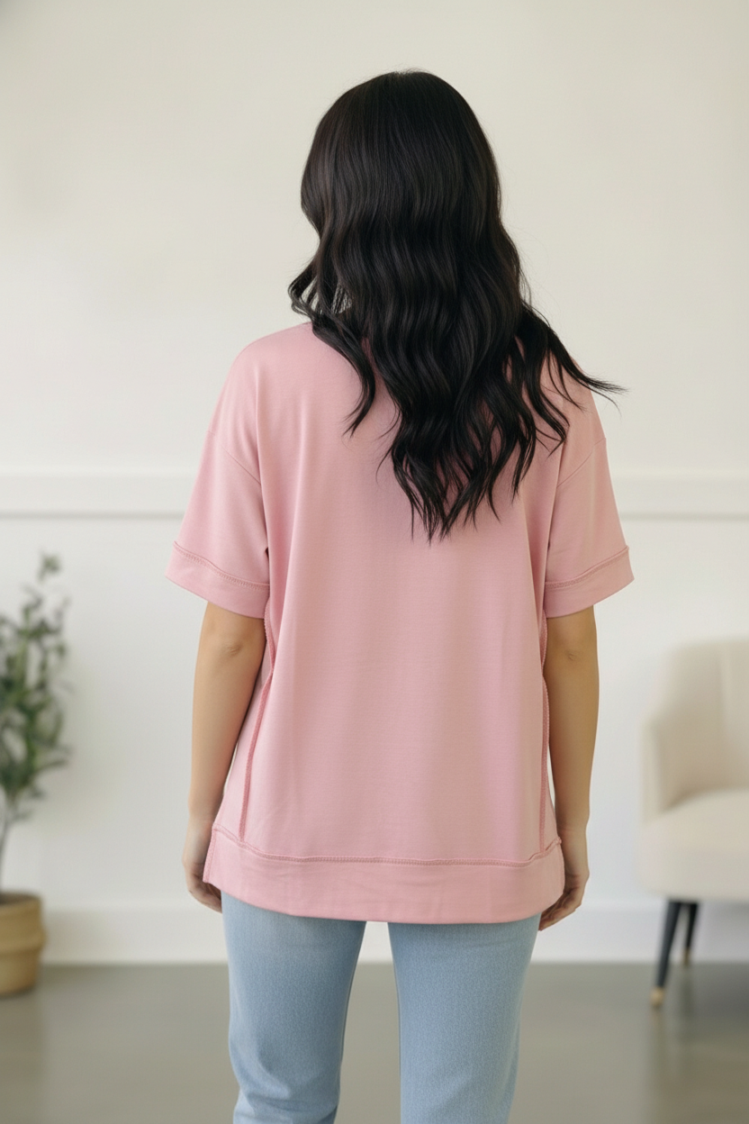 This short sleeve loose fit knit pullover features cap short sleeves and a hi-lo hem design. Super soft with stunning outseam reverse stitching, this will soon be your fall go-to staple! Wear with all your denim.