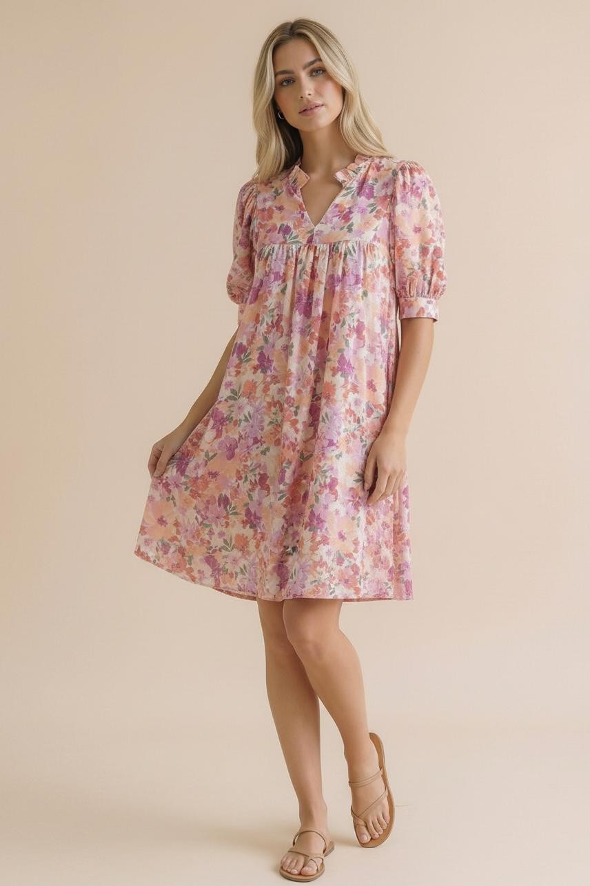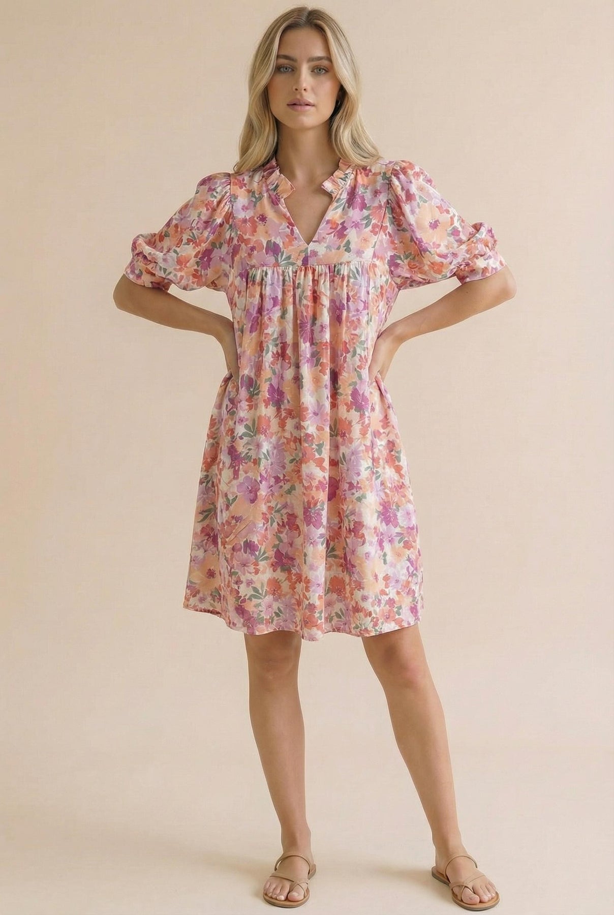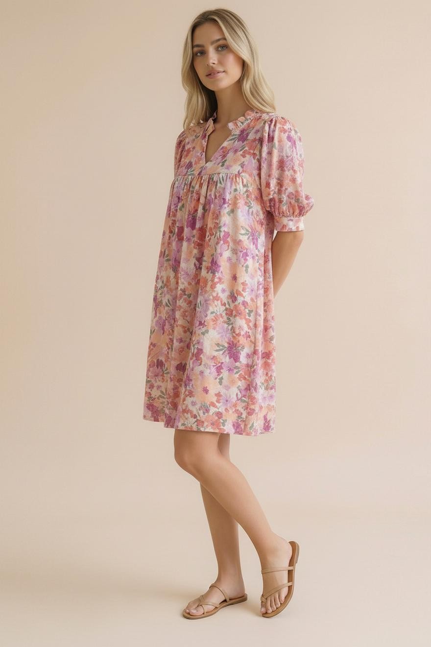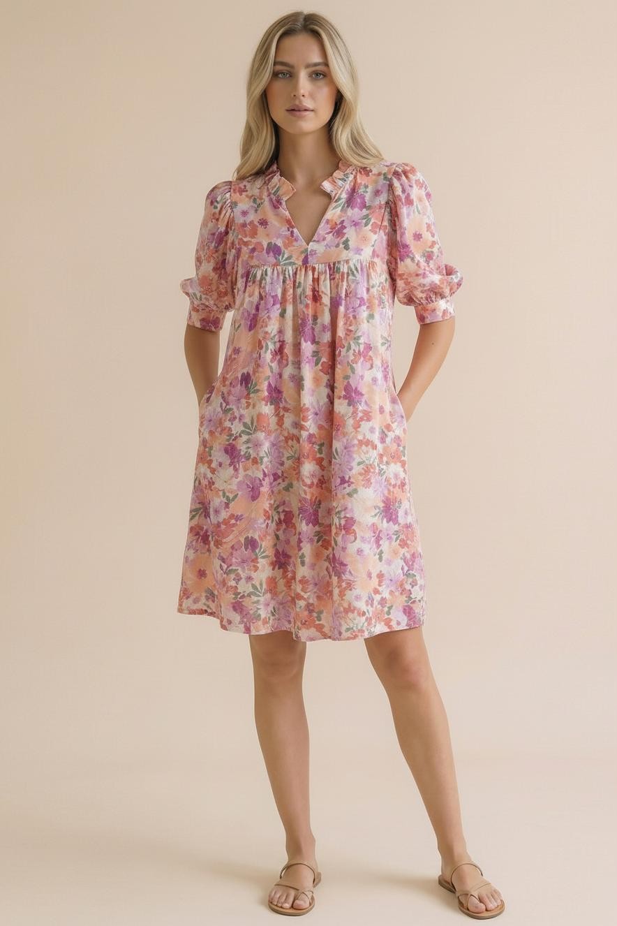 FRILLED NOTCH NECK YOKE BUBBLE SHORT SLEEVE FLORAL PRINT SHIFT WOVEN DRESS WITH SIDE POCKETS
