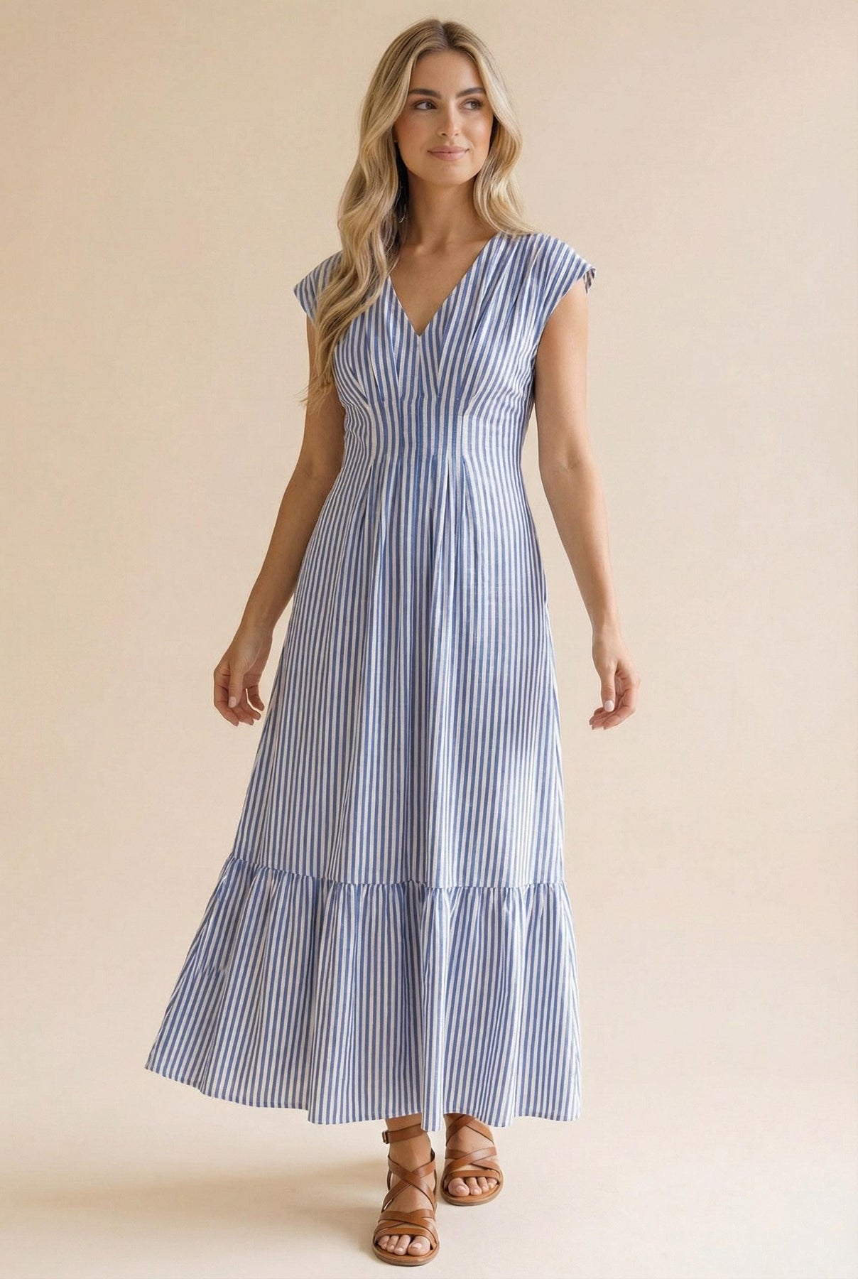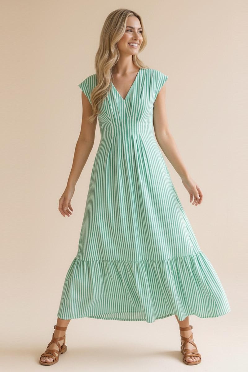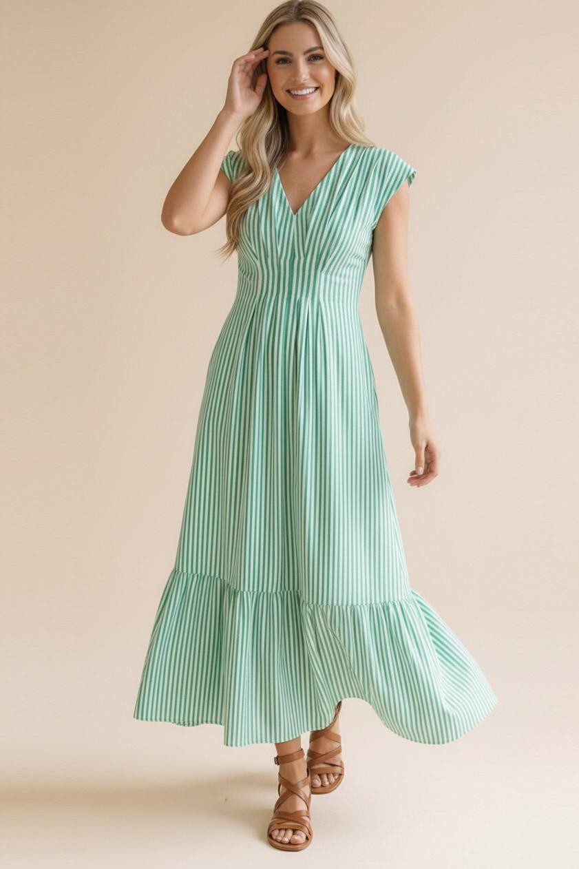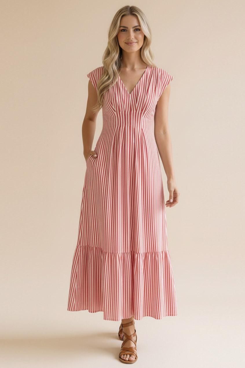 V NECK CAP SLEEVE PLEATED DETAIL FULLY LINED VERTICAL STRIPE WOVEN MAXI DRESS WITH BACK SMOCKED WAIST AND SIDE POCKETS