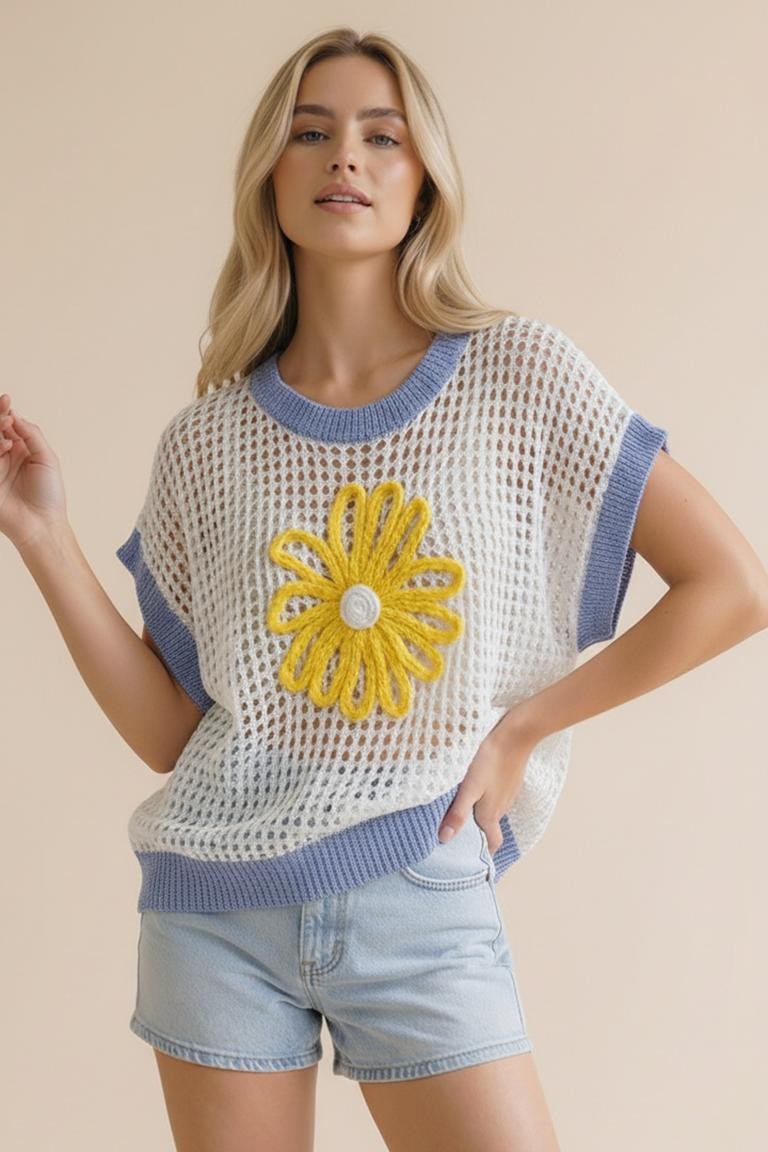 ROUND NECK DOLMAN SHORT SLEEVE EMBROIDERY FLOWER COLOR BLOCK NETTED SWEATER KNIT TOP