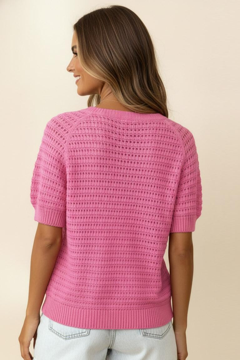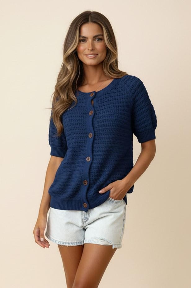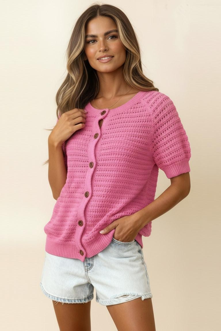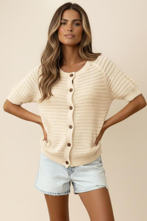 ROUND NECK RAGLAN SHORT SLEEVE BUTTON DOWN TEXTURED SWEATER CARDIGAN