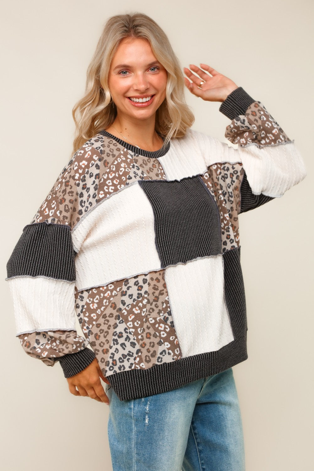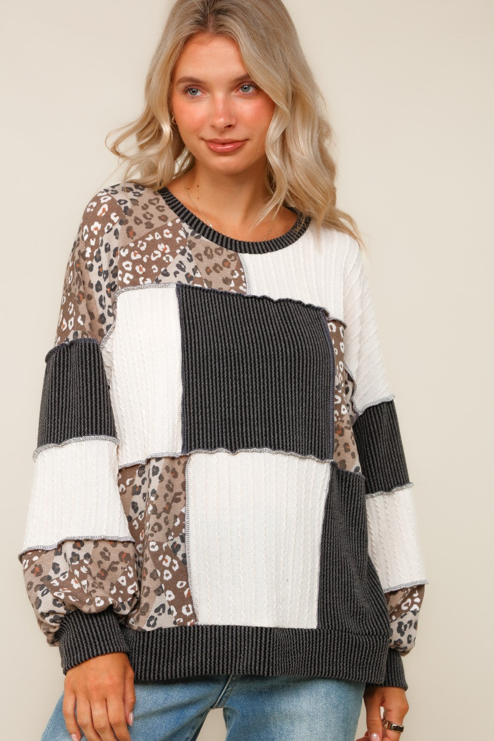 ROUND NECK BUBBLE LONG SLEEVE RIB CABLE KNIT LEOPARD PRINT FRENCH TERRY COLOR BLOCK PATCHWORK PULLOVER KNIT TOP